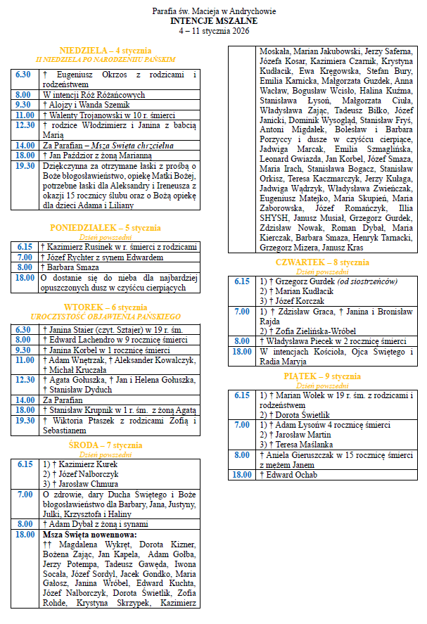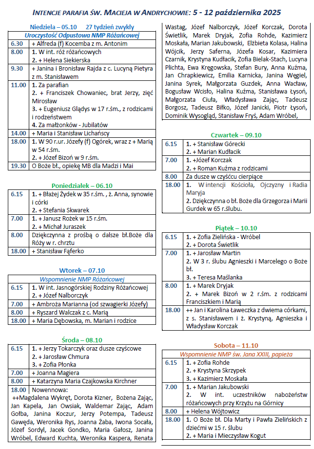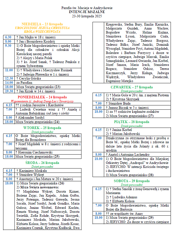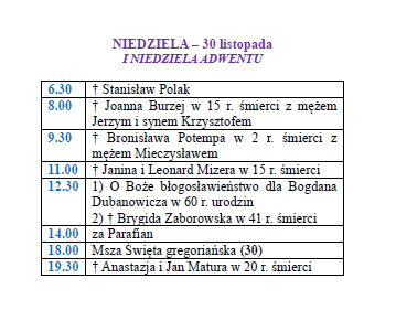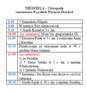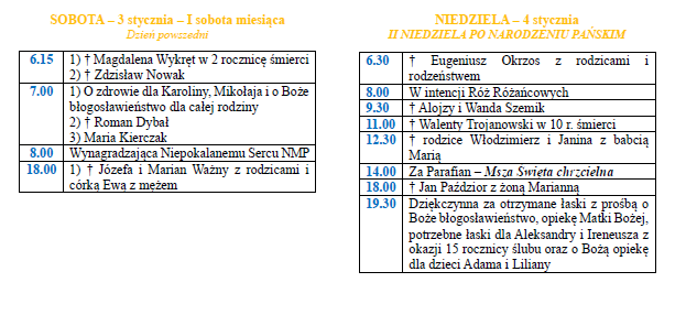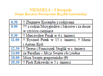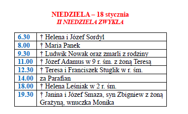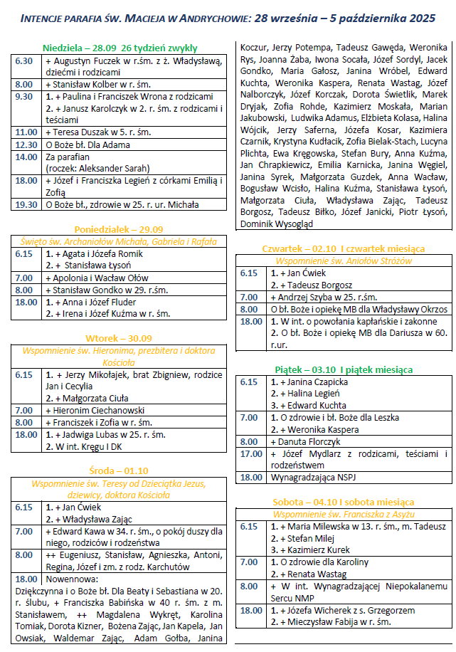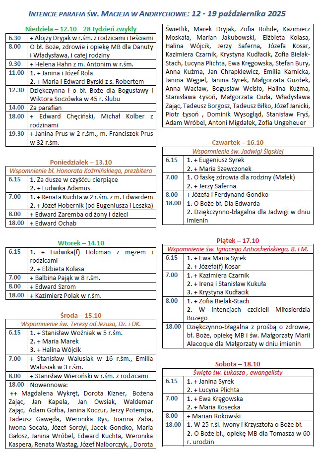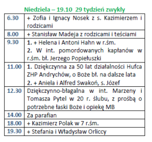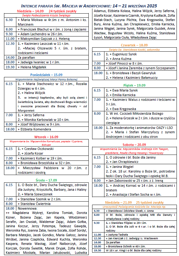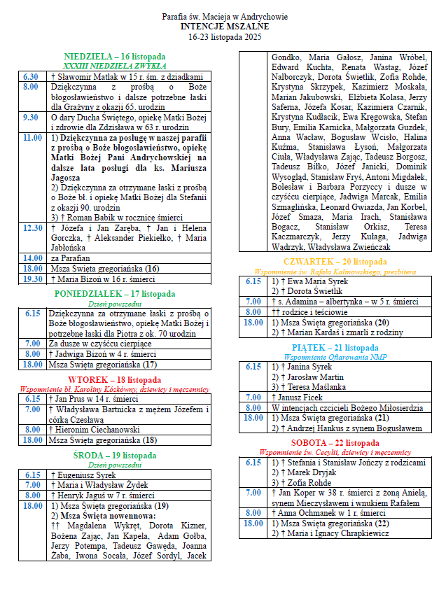 18:00 O bł. Boże i potrzebne łaski dla Klaudii w r. urodzin, ++ Maria Panek, Grzegorz Niewiara, Renata Kuchta, Bronisława Potempa, Magdalena Wykręt, Karolina Tomiak, Mirosław Ryczek, Dorota Kizner, Rafał Wykręt, Jan Kiszczak Jerzy Ćwiertka, Mariusz Karcz, Stanisława Wójcik, Wanda Otfinowska, Józefa Matusiak, Marian Polak, Bożena Zając, Maria Lachendro, Wiesława Sordyl, Krystyna Kozieł, Cecylian Kiliński, Jan Kapela, Włodzimierz Serafin, Jolanta Pietrzak, Katarzyna Stefańska-Polak, Marian Marczyński, Jan Owsiak, Franciszka Weźranowska, Zofia Socała, Stanisława Siwek, Waldemar Zając, Jadwiga Iwaniec, Jerzy Honkisz, Adam Gołba, Emilia Matura, Czesław Żywioł, Barbara Młyńska, Apolonia Polak, Janina Koczur, Jerzy Potempa, Elżbieta Bystrzycka, Wiesława Jarosz, Maciej Fujawa, Elżbieta Paleczna, Teresa Szeliga, Tadeusz Gawęda Anna Ochmanek Maria Urbańczyk Maria Babińska-Prorok, Janina Konior, Maria Zaremba, Franciszek Wąs, Janina Matusiak, Anastazja Pieronkiewicz, Władysław Łysoń, Stanisław Byrdy, Weronika Rys, Stanisław Kuś, Helena Osowska, Magdalena Ćwiertnia, Eleonora Wróblewska, Halina Bylica