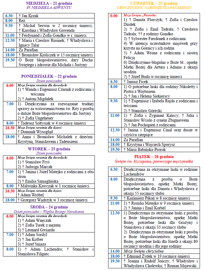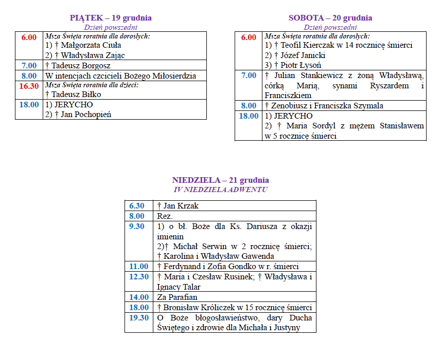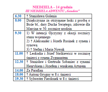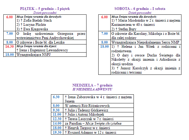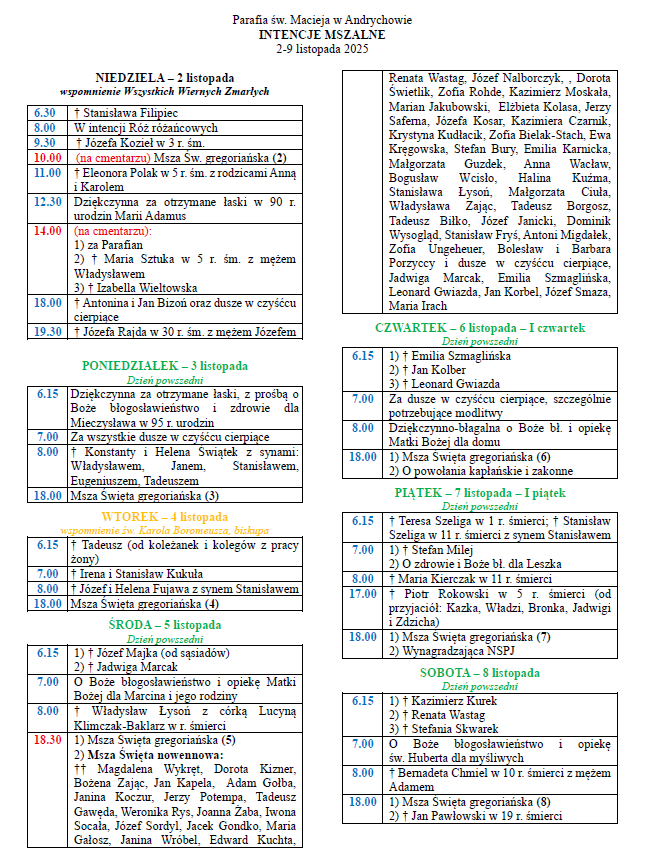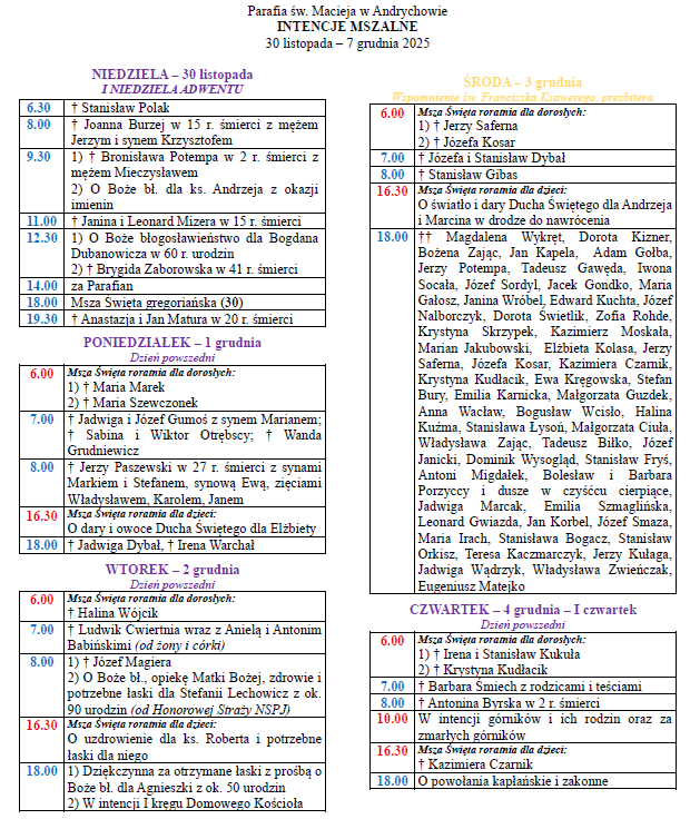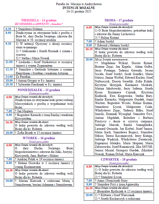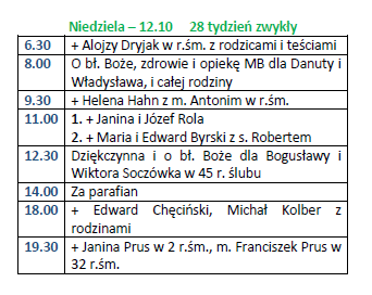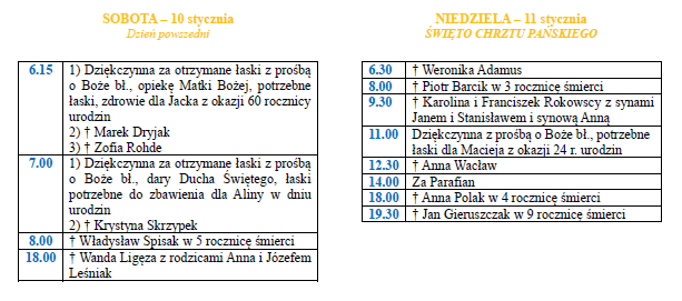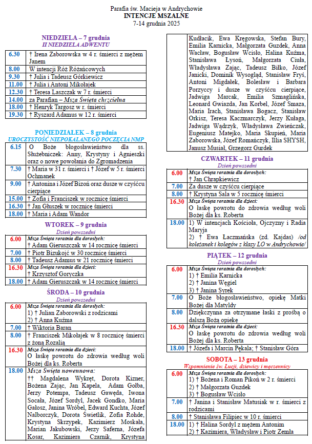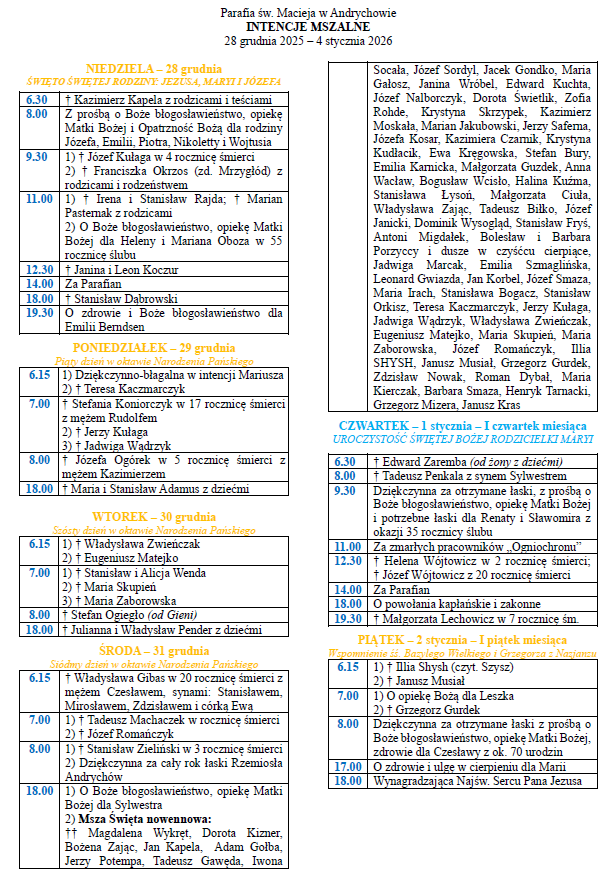 18:00 O bł. Boże i potrzebne łaski dla Klaudii w r. urodzin, ++ Maria Panek, Grzegorz Niewiara, Renata Kuchta, Bronisława Potempa, Magdalena Wykręt, Karolina Tomiak, Mirosław Ryczek, Dorota Kizner, Rafał Wykręt, Jan Kiszczak Jerzy Ćwiertka, Mariusz Karcz, Stanisława Wójcik, Wanda Otfinowska, Józefa Matusiak, Marian Polak, Bożena Zając, Maria Lachendro, Wiesława Sordyl, Krystyna Kozieł, Cecylian Kiliński, Jan Kapela, Włodzimierz Serafin, Jolanta Pietrzak, Katarzyna Stefańska-Polak, Marian Marczyński, Jan Owsiak, Franciszka Weźranowska, Zofia Socała, Stanisława Siwek, Waldemar Zając, Jadwiga Iwaniec, Jerzy Honkisz, Adam Gołba, Emilia Matura, Czesław Żywioł, Barbara Młyńska, Apolonia Polak, Janina Koczur, Jerzy Potempa, Elżbieta Bystrzycka, Wiesława Jarosz, Maciej Fujawa, Elżbieta Paleczna, Teresa Szeliga, Tadeusz Gawęda Anna Ochmanek Maria Urbańczyk Maria Babińska-Prorok, Janina Konior, Maria Zaremba, Franciszek Wąs, Janina Matusiak, Anastazja Pieronkiewicz, Władysław Łysoń, Stanisław Byrdy, Weronika Rys, Stanisław Kuś, Helena Osowska, Magdalena Ćwiertnia, Eleonora Wróblewska, Halina Bylica